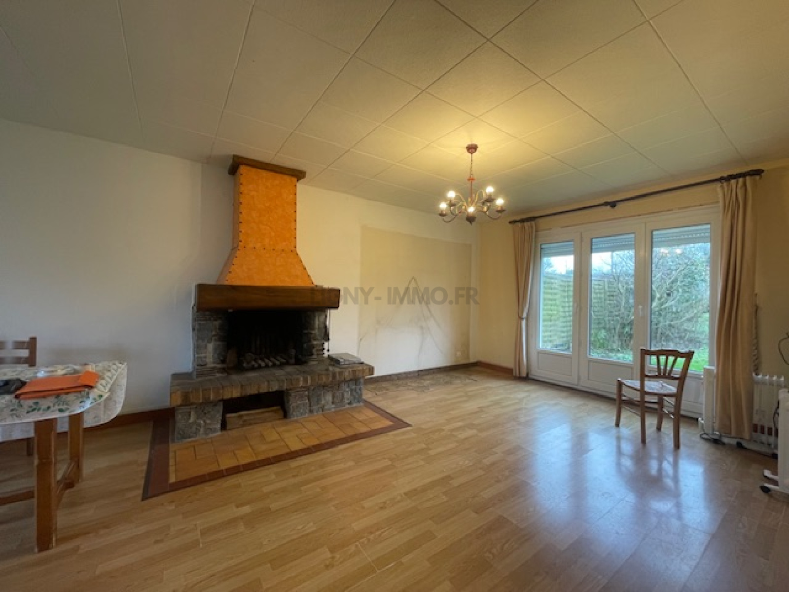 -en rez-de-chaussée: entrée, cuisine aménagée donnant sur jardin, grand séjour de 28 m² avec cheminée à l'âtre, salle de douche avec wc.
