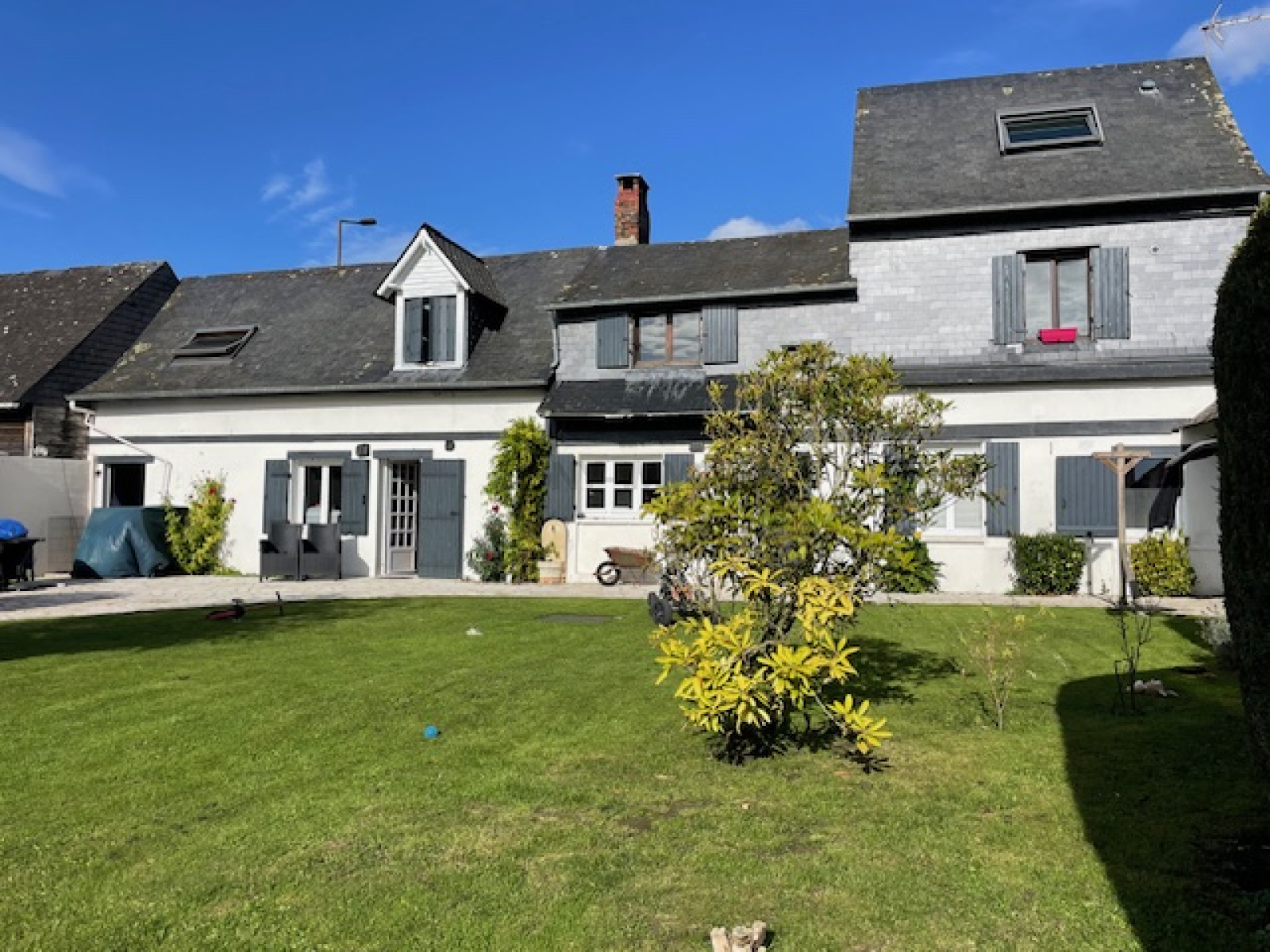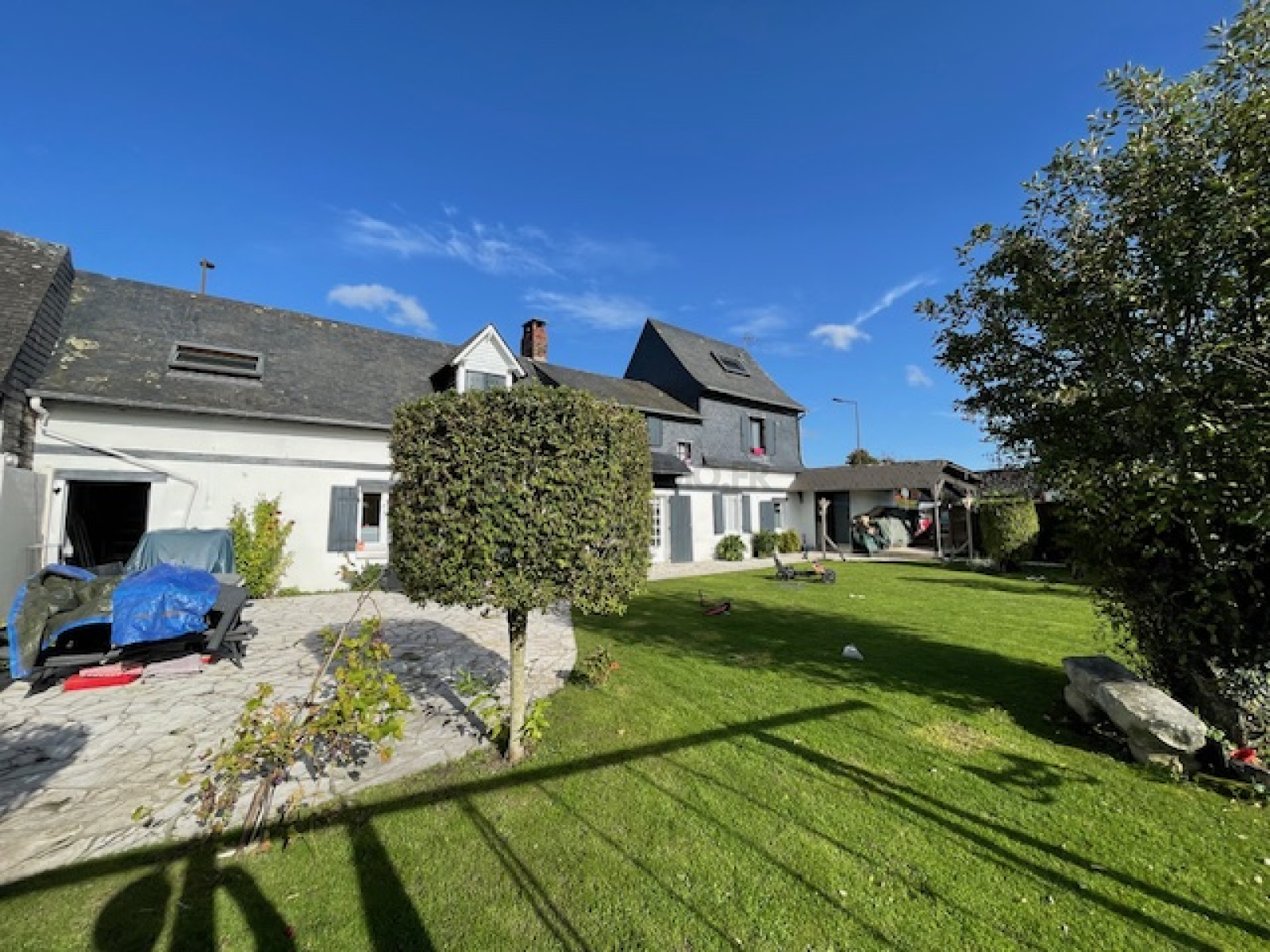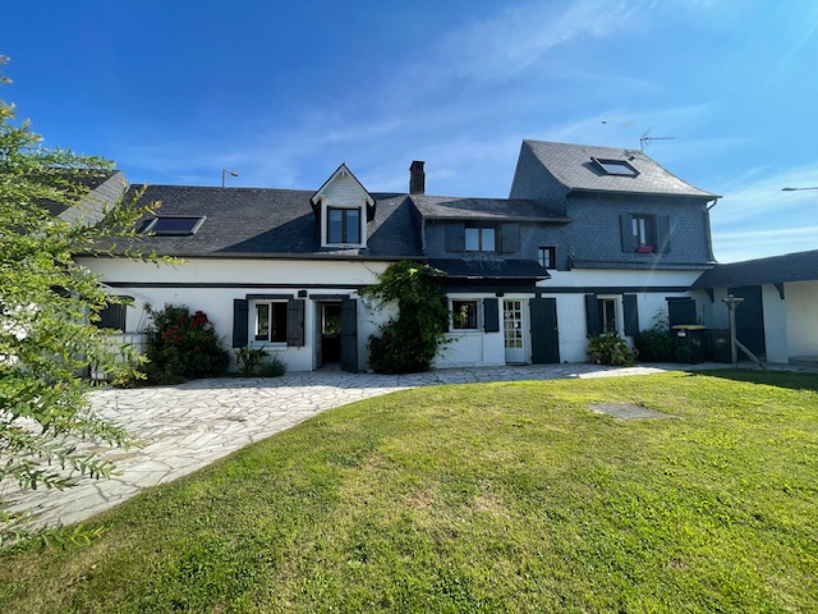 Dans un village avec boulangerie et école primaire, non loin des commerces d'un bourg dynamique, spacieuse maison normande mitoyenne d'un côté coiffée en ardoises naturelles, elle comprend: