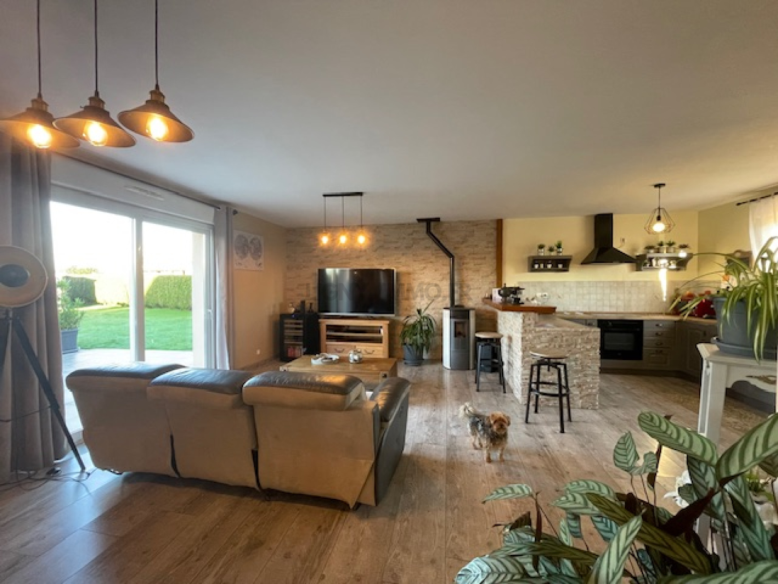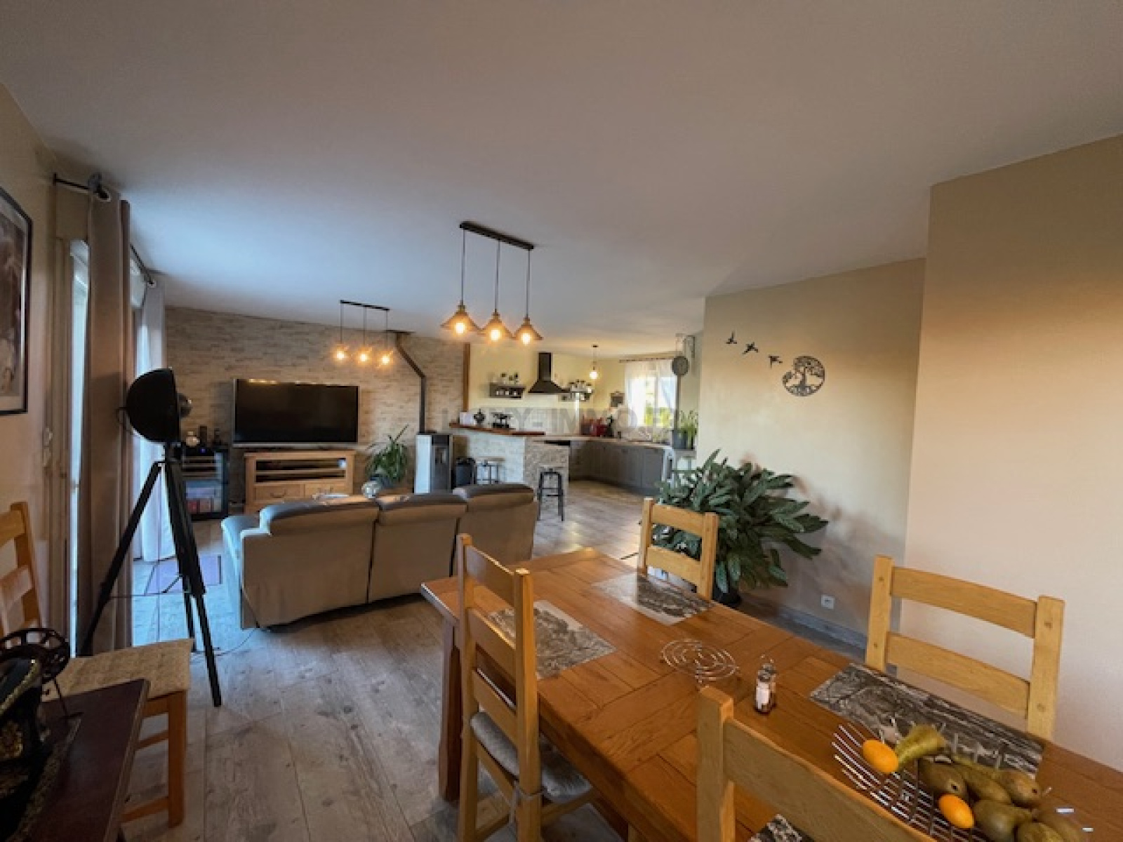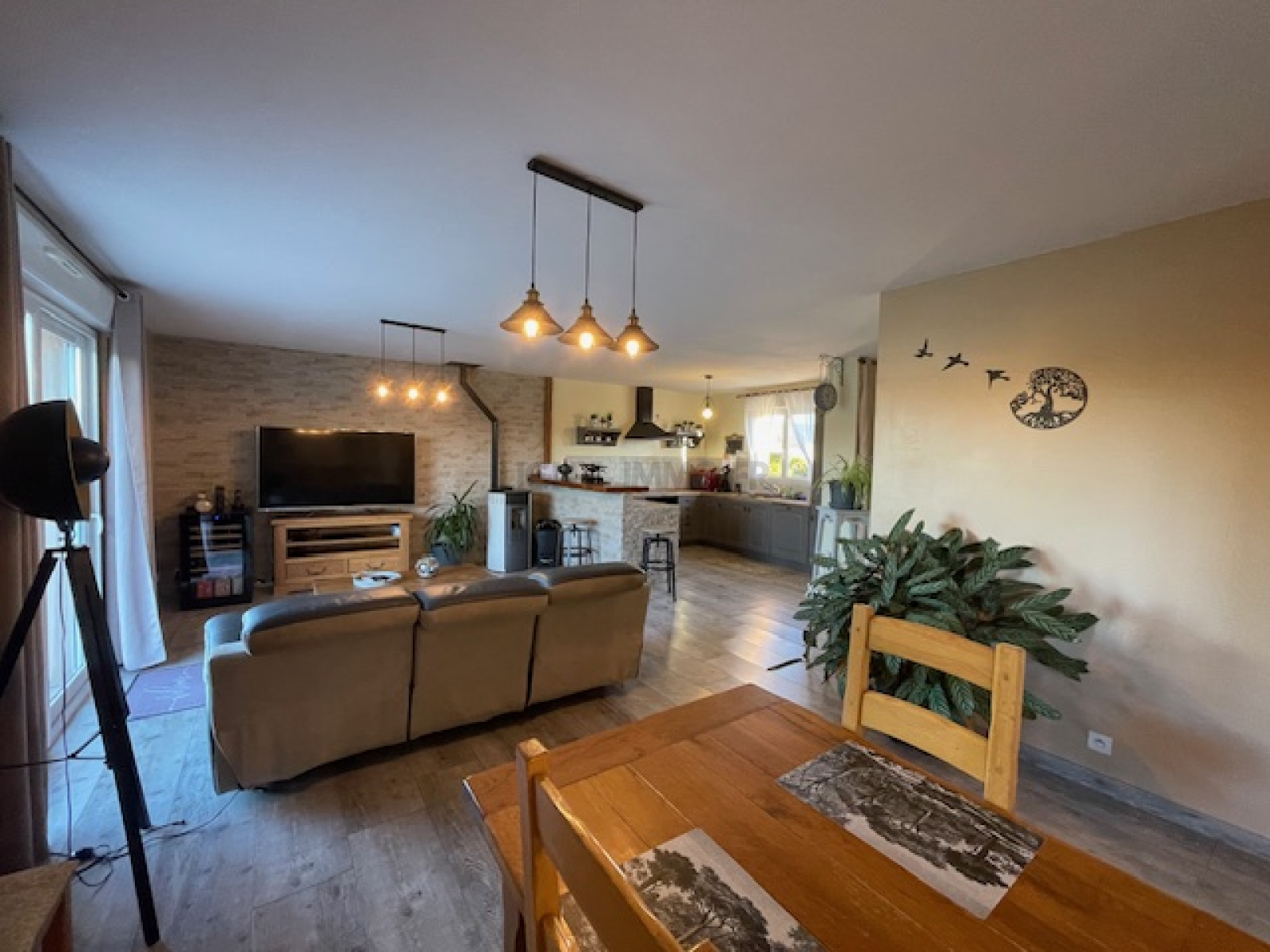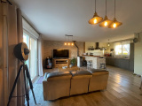 entrée, cuisine aménagée-équipée ouverte sur une spacieuse pièce de vie avec poêle à pellets donnant sur une belle terrasse. Trois chambres, jolie salle de douche et wc. Deux places de parking, dépendance et abri de jardin. Le tout sur un beau jardin clos et arboré. Taxe foncière 693 €.